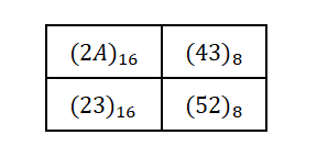 A=(52)10 B=(103)8 C=(A25.6C)16