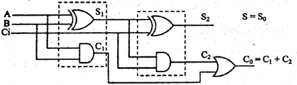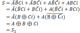 তিনটি ইনপুট A,B Ci এর ক্ষেত্রে ফুল অ্যাডারের সত্যক সারণি থেকে লেখা যায় যে,