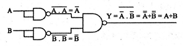 OR গেইট বাস্তবায়ন : দুইটি NAND গেইটের আউটপুটকে পুনরায় NAND গেইট দিয়ে প্রবাহিত করলে OR গেইট হিসেবে কাজ করে