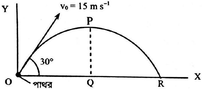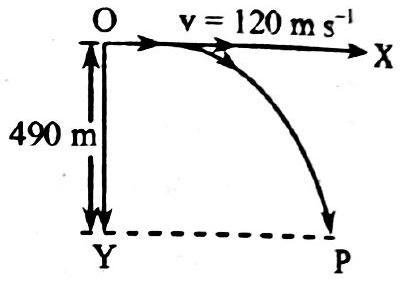 একটি বোমারু বিমান ভূমি হতে 490 m উচ্চতায় ভূমির সমান্তরালে    বেগে বোমা ফেলে দিল ভূপৃষ্ঠের উপর P একটি বিন্দু